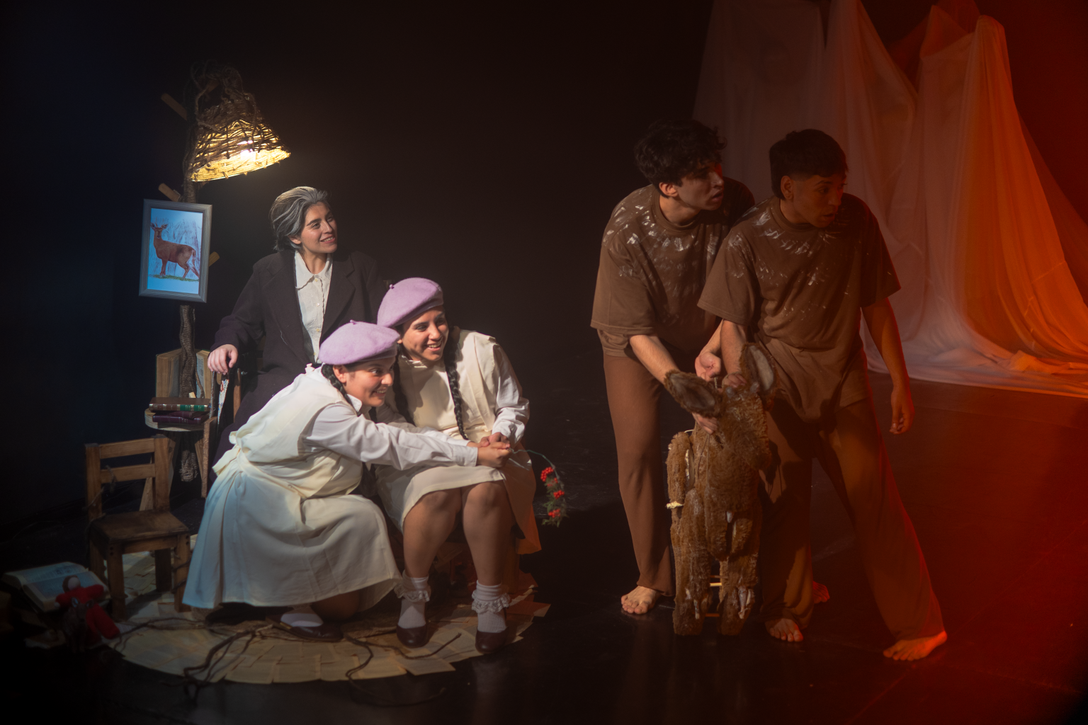 Canta el viento de tu nombre propone una lectura escénica y sensible del viaje póstumo de Mistral por la geografía y el alma del país. La pieza imagina a la poeta después de la muerte, retornando en un segundo cuerpo —un cuerpo de niebla— que desciende desde los cielos para recorrer Chile desde el norte seco y caluroso hasta el sur frío y húmedo, acompañada por un huemul cachorro y un niño diaguita que, como ella, han perdido a sus madres.